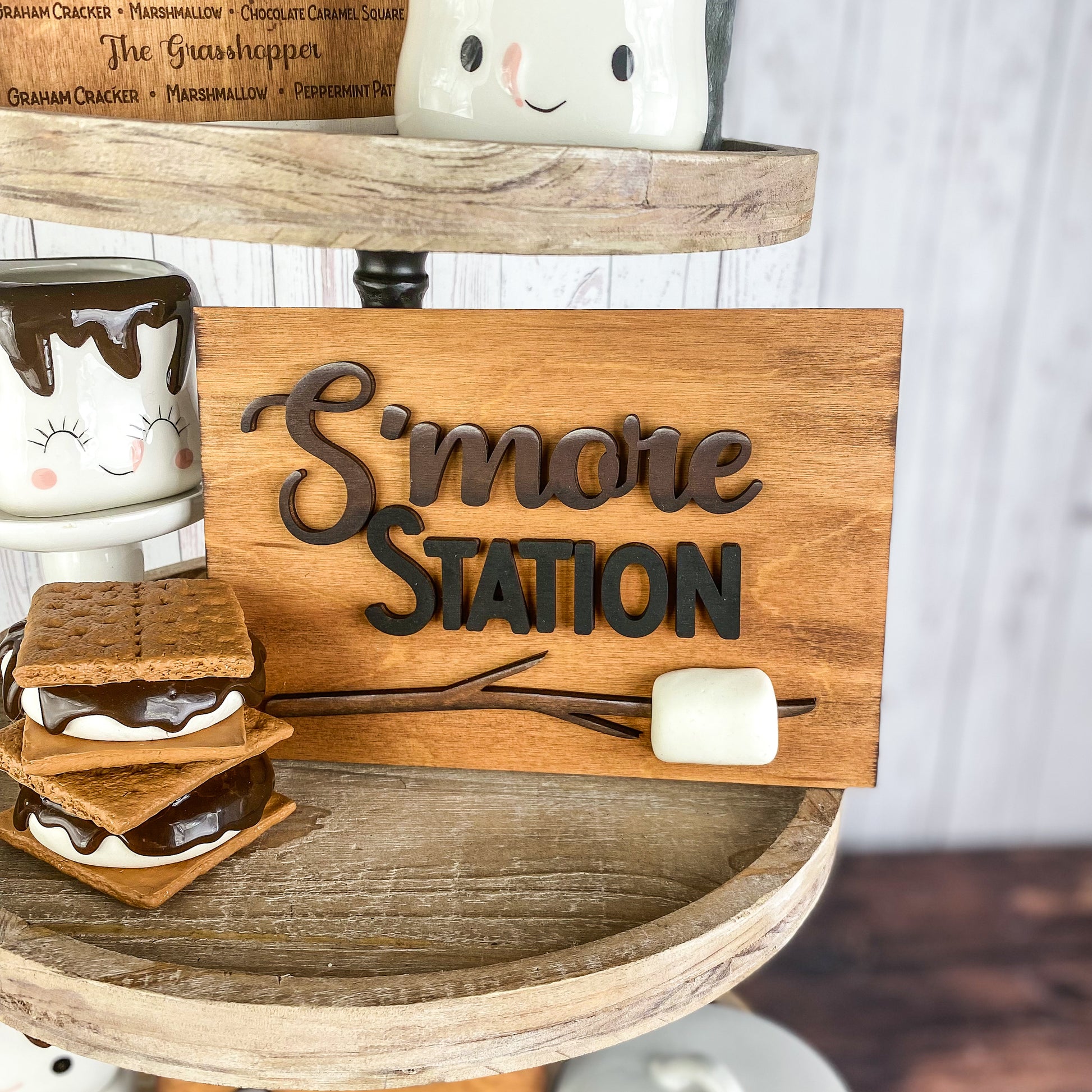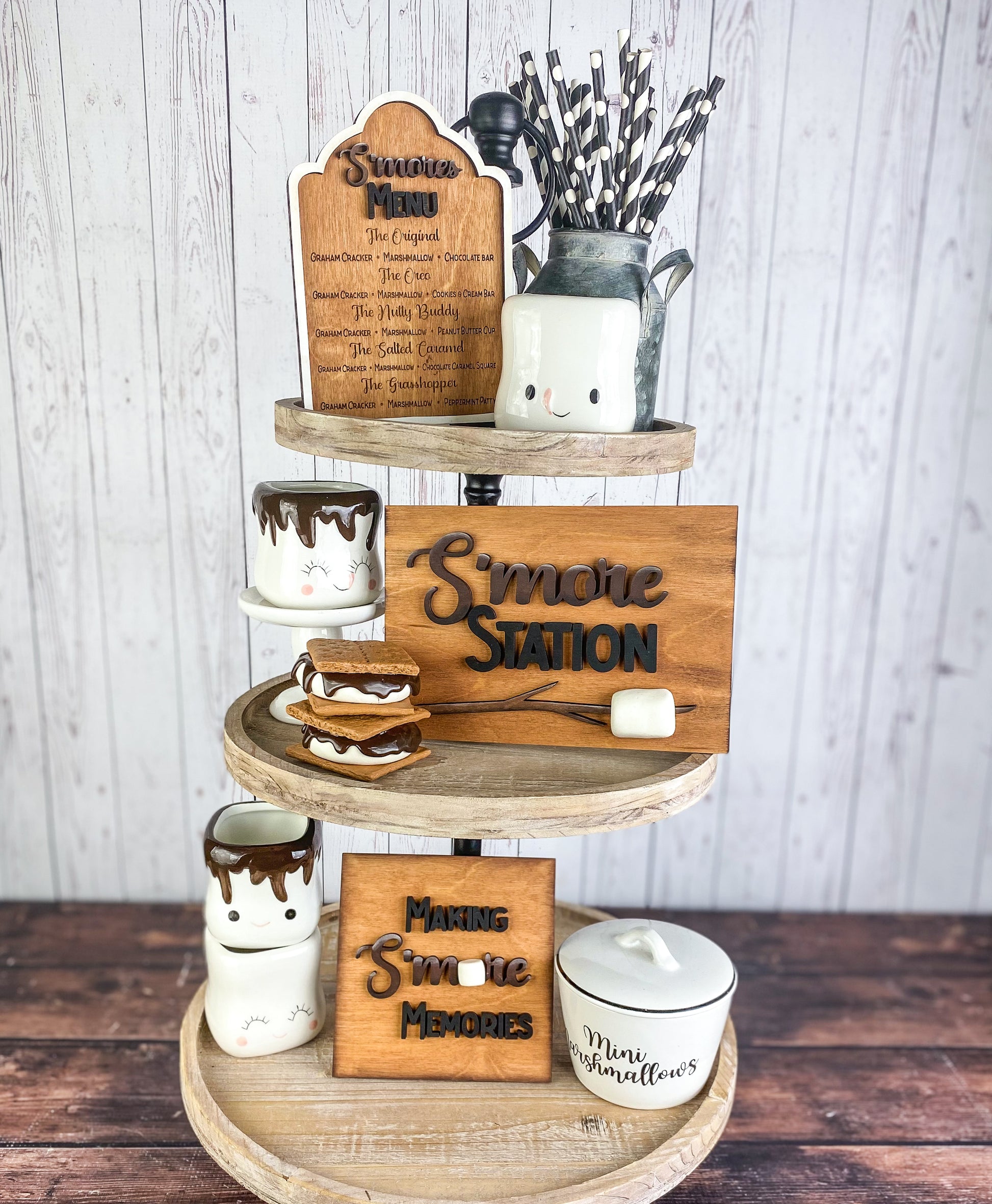How adorable is this s'mores tiered tray sign set?! This would make the perfect addition to any s'mores bar, party or camp out! This is a 4 piece set (wood signs and faux smores, no props or tray) Each piece has different 3D elements.