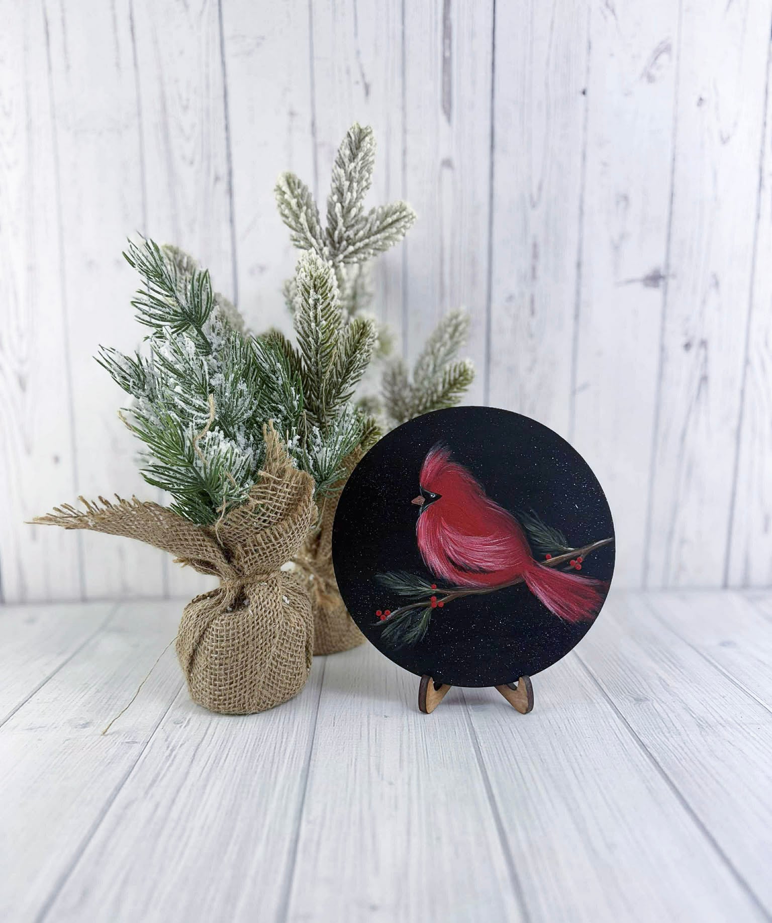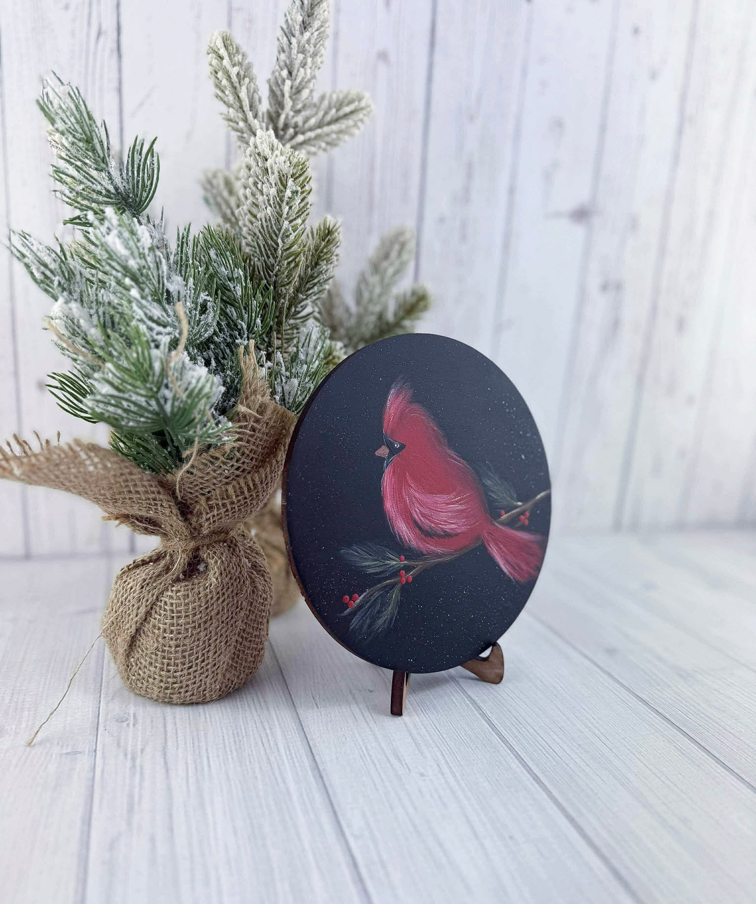 Round wooden sign with festive cardinal artwork