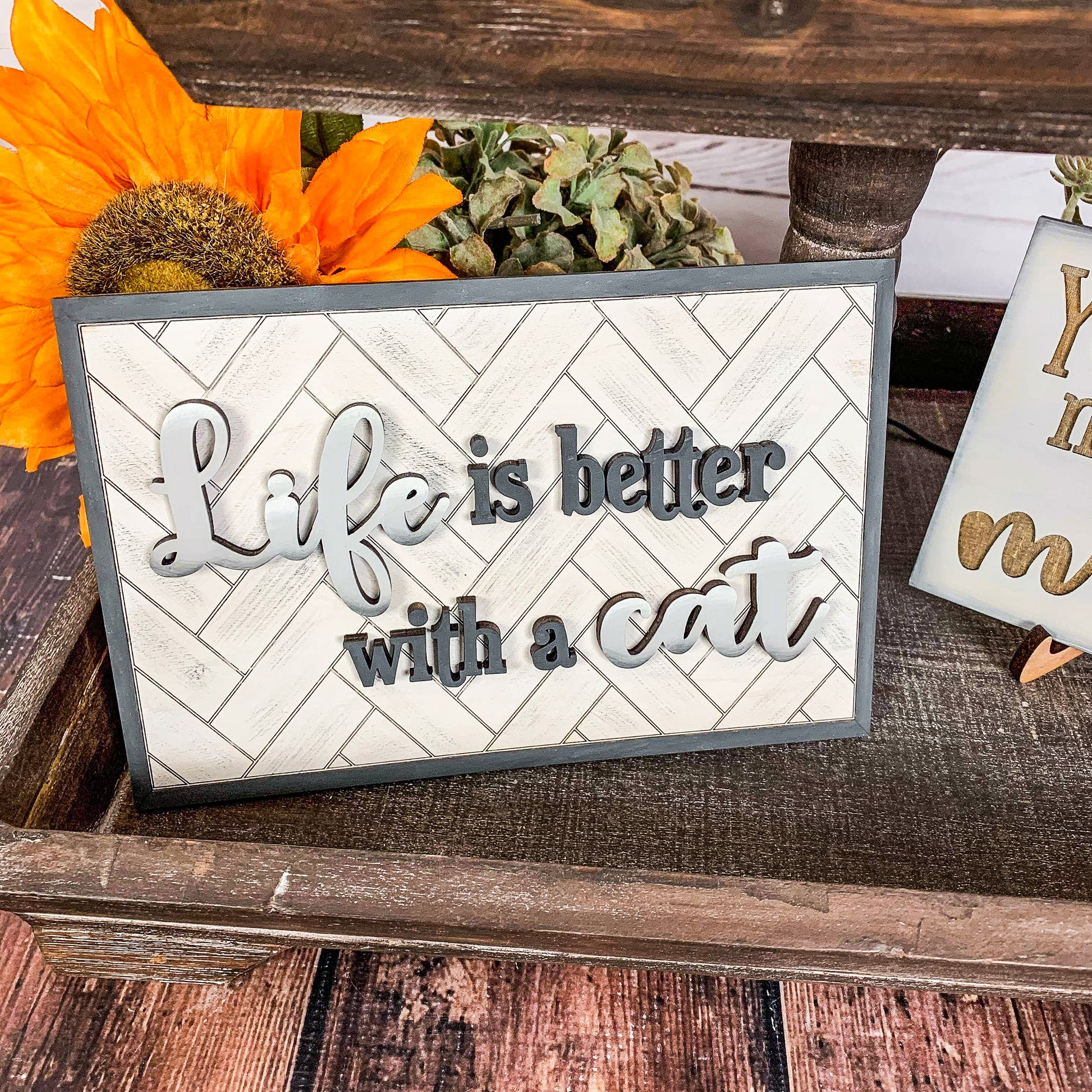 This Cat Sign Bundle adds purr-fect charm to your home! Perfect for any cat lover, this bundle includes four beautiful signs with inspiring words for you and your furry friend. Spruce up the walls of your living room, bedroom, or hallway with these adorable tiered tray signs!