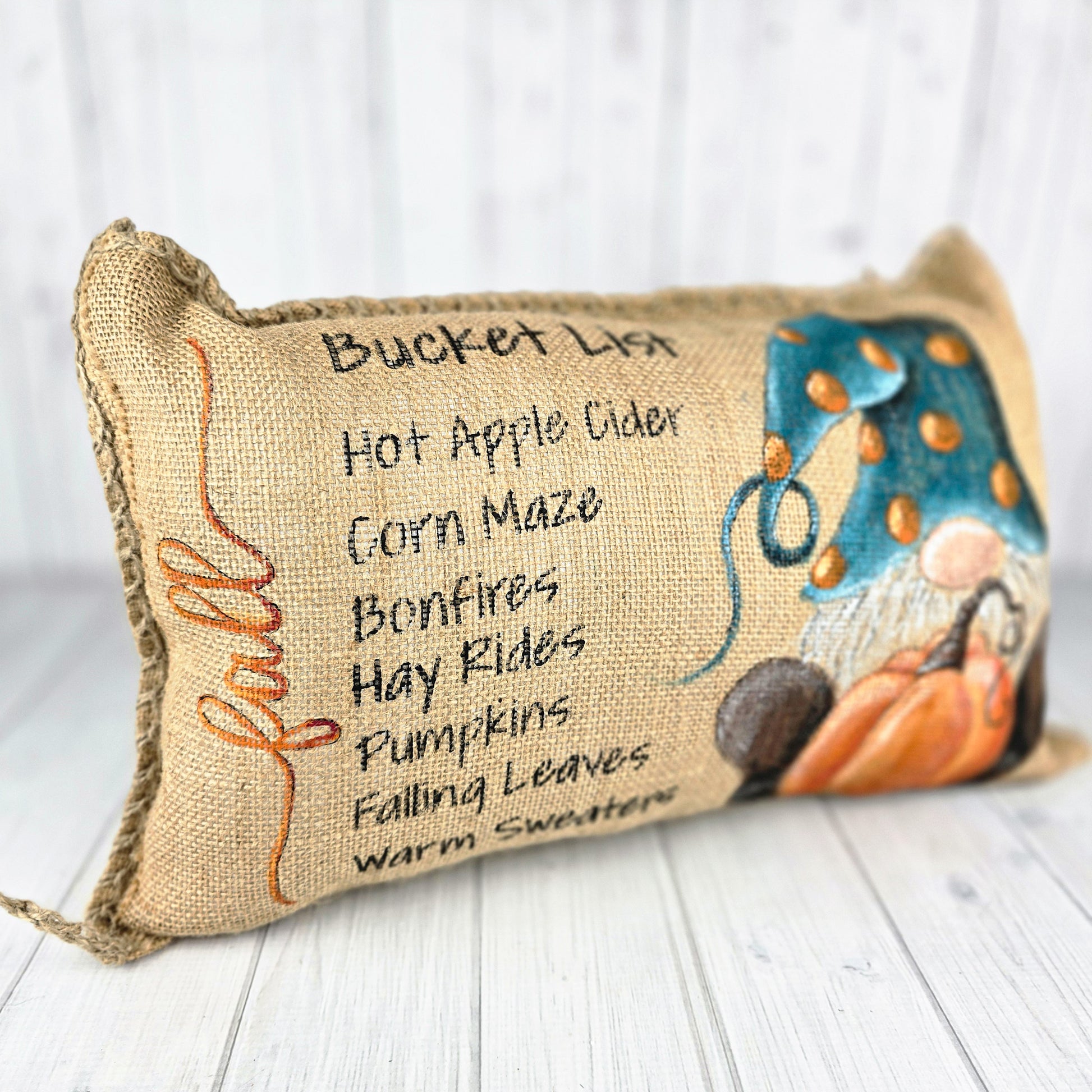 Embrace the cozy vibes of autumn with our charming burlap porch pillow, featuring a delightful fall bucket list design! πβ¨