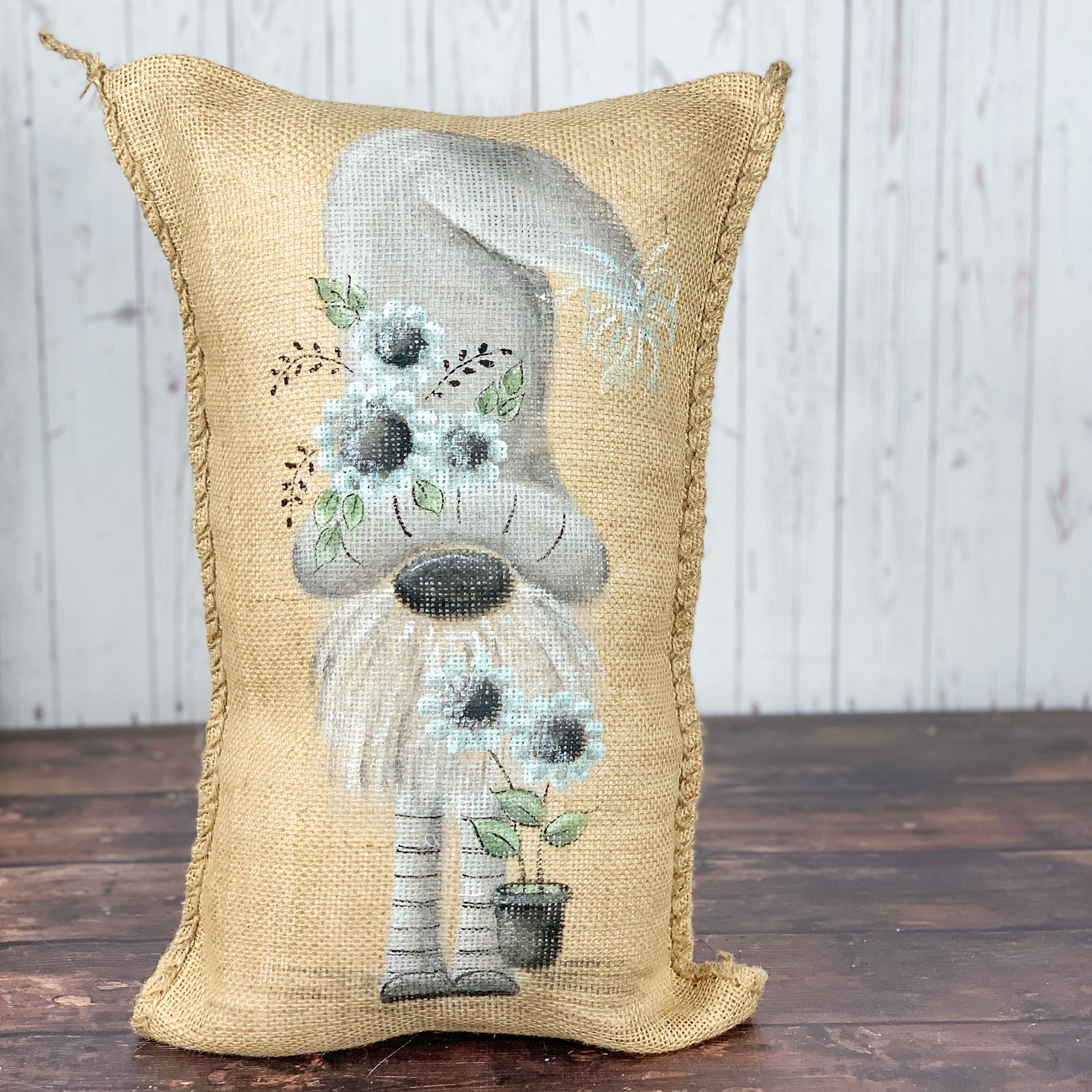 Our gray gnome floral pillow is perfect for using as front porch decor or even inside in your home. These burlap pillows are hand painted so every design is unique to itself. It will be the same design but due to being hand made it cannot be duplicated exactly every time. This means your cottage pillow is unique and one of a kind! How amazing is that?!