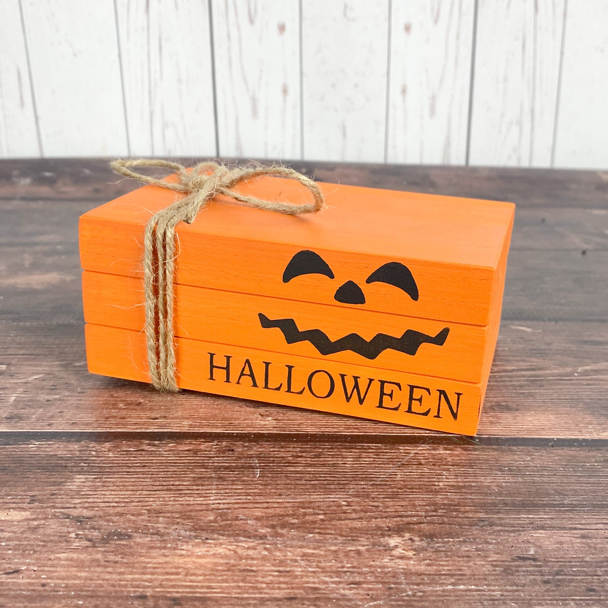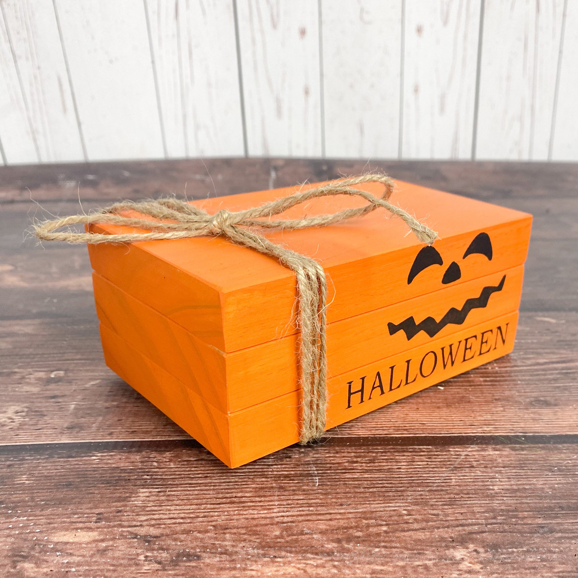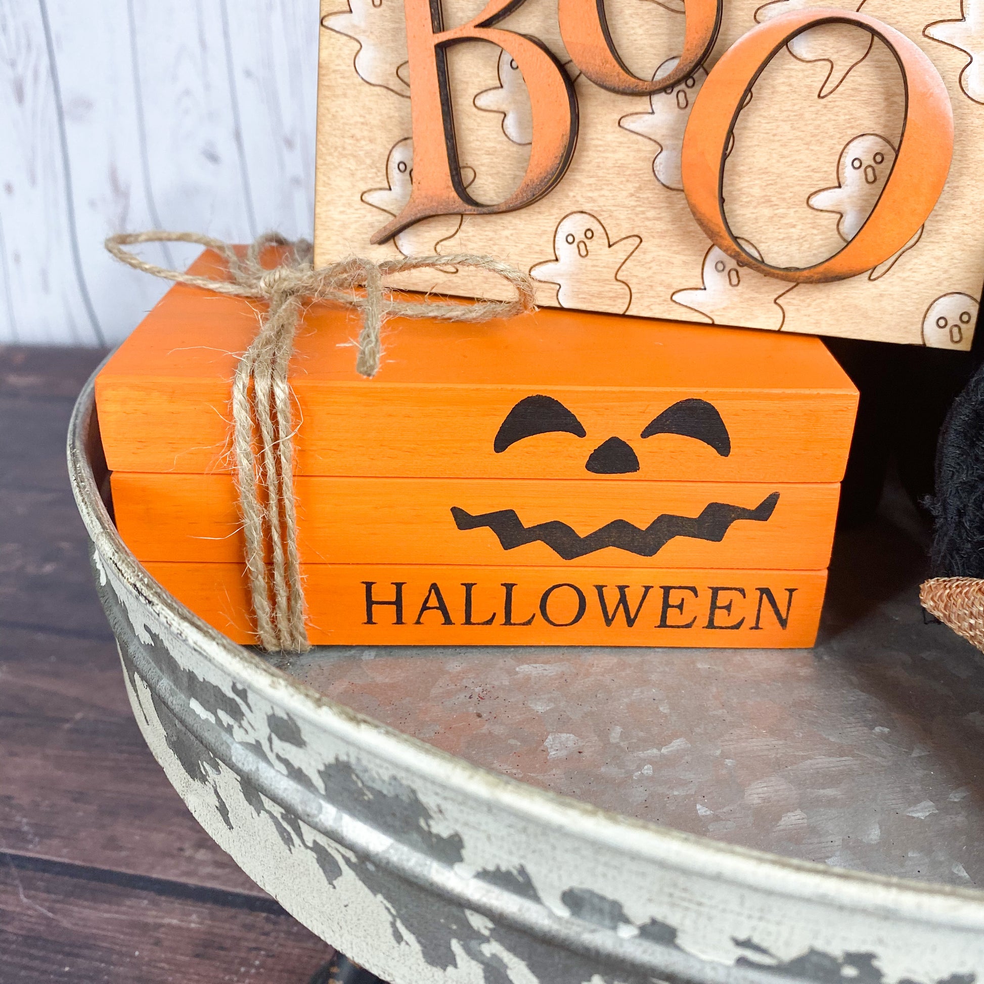 Halloween faux stacked book set for your Halloween tiered tray decor. This sign features white writing on a black background with jute tied around it and tied into a little bow. If you love this check out our Halloween bundles to get everything you love all together.