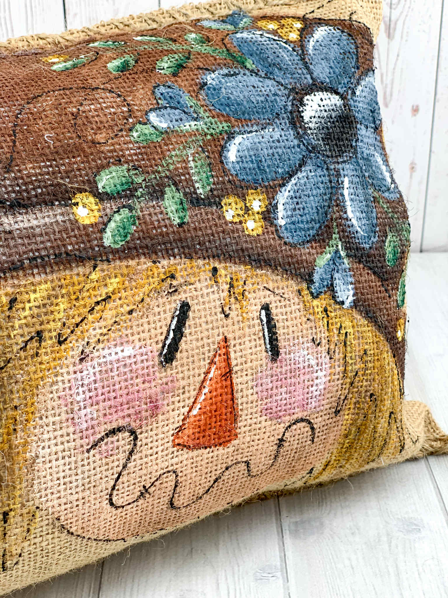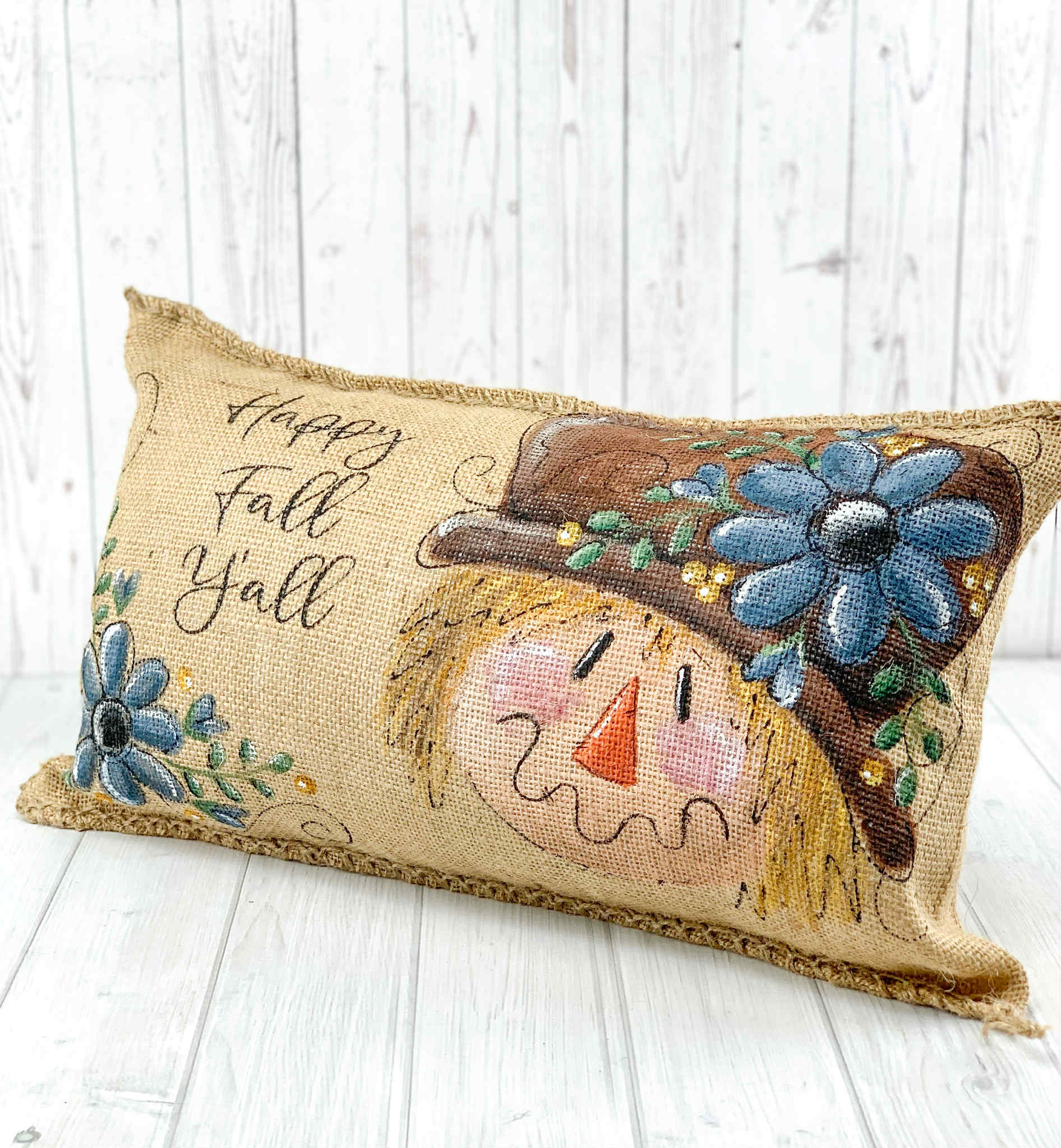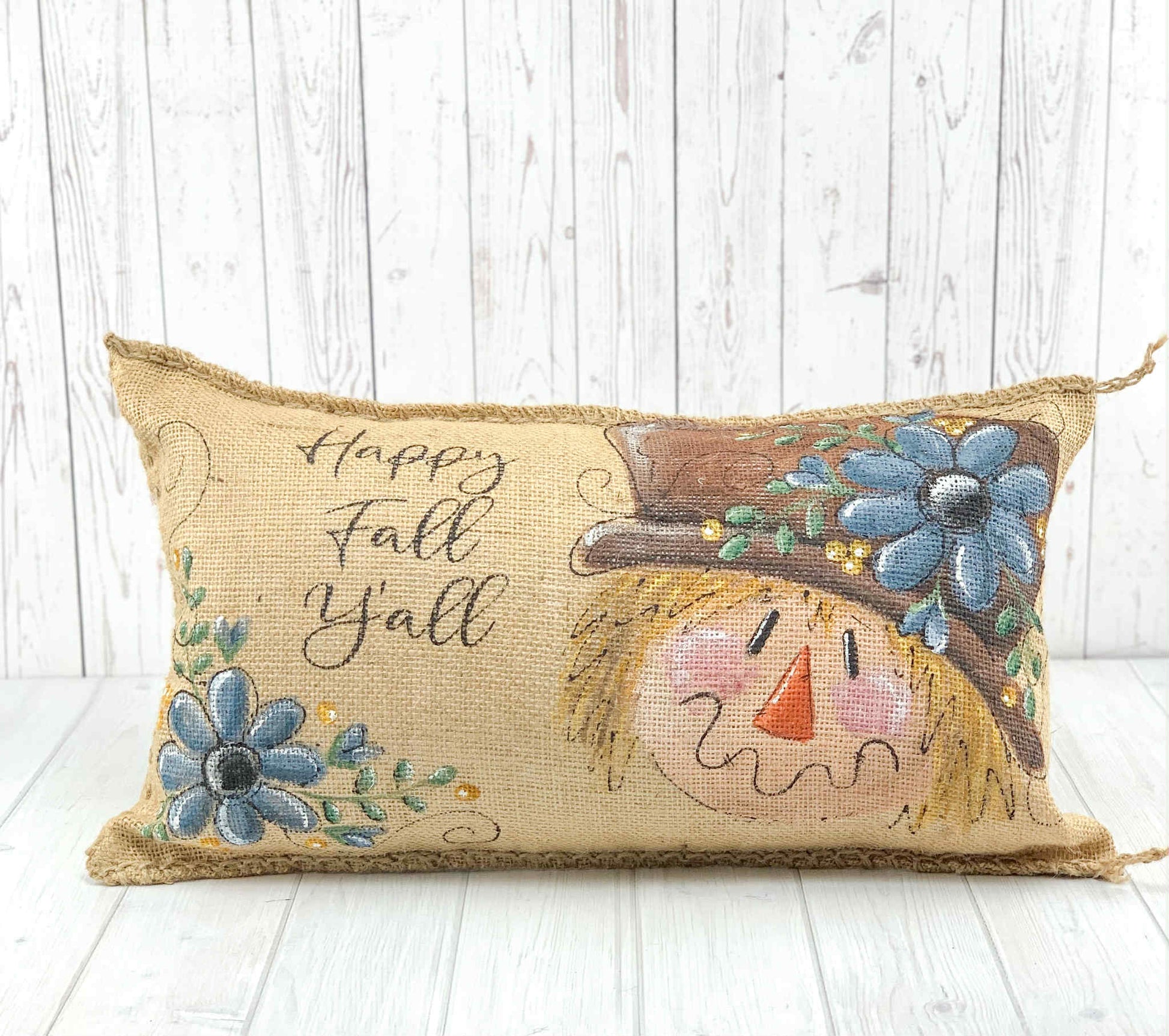 Bring a cozy touch of autumn charm into your home with this “Happy Fall Y’all” scarecrow pillow. Hand-painted on rustic burlap, this decorative accent pillow features a cheerful scarecrow face with rosy cheeks, a brown hat, and blue flowers — perfect for creating a warm and inviting seasonal look.