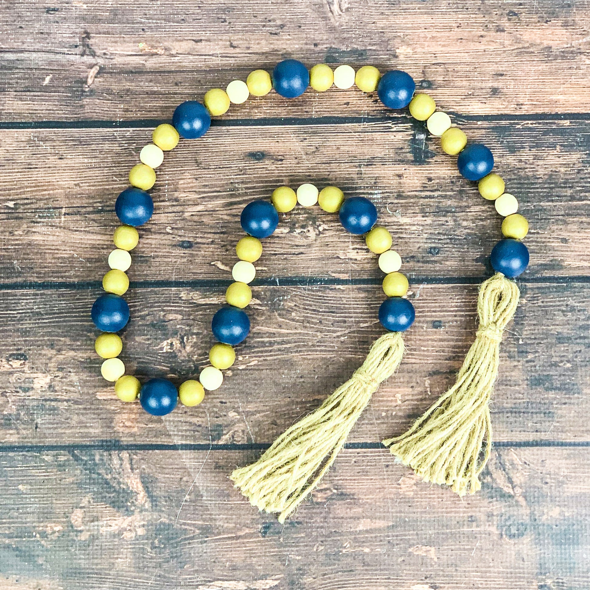 Navy & Gold Farmhouse wood bead garland gives your home decor that extra sparkle during the holiday season and can be used as an everyday garland as well. It adds just the right amount of color to any mantle or stack of books. Garlands can be used to decorate is so many ways, but my favorite way is wrapped around vase.