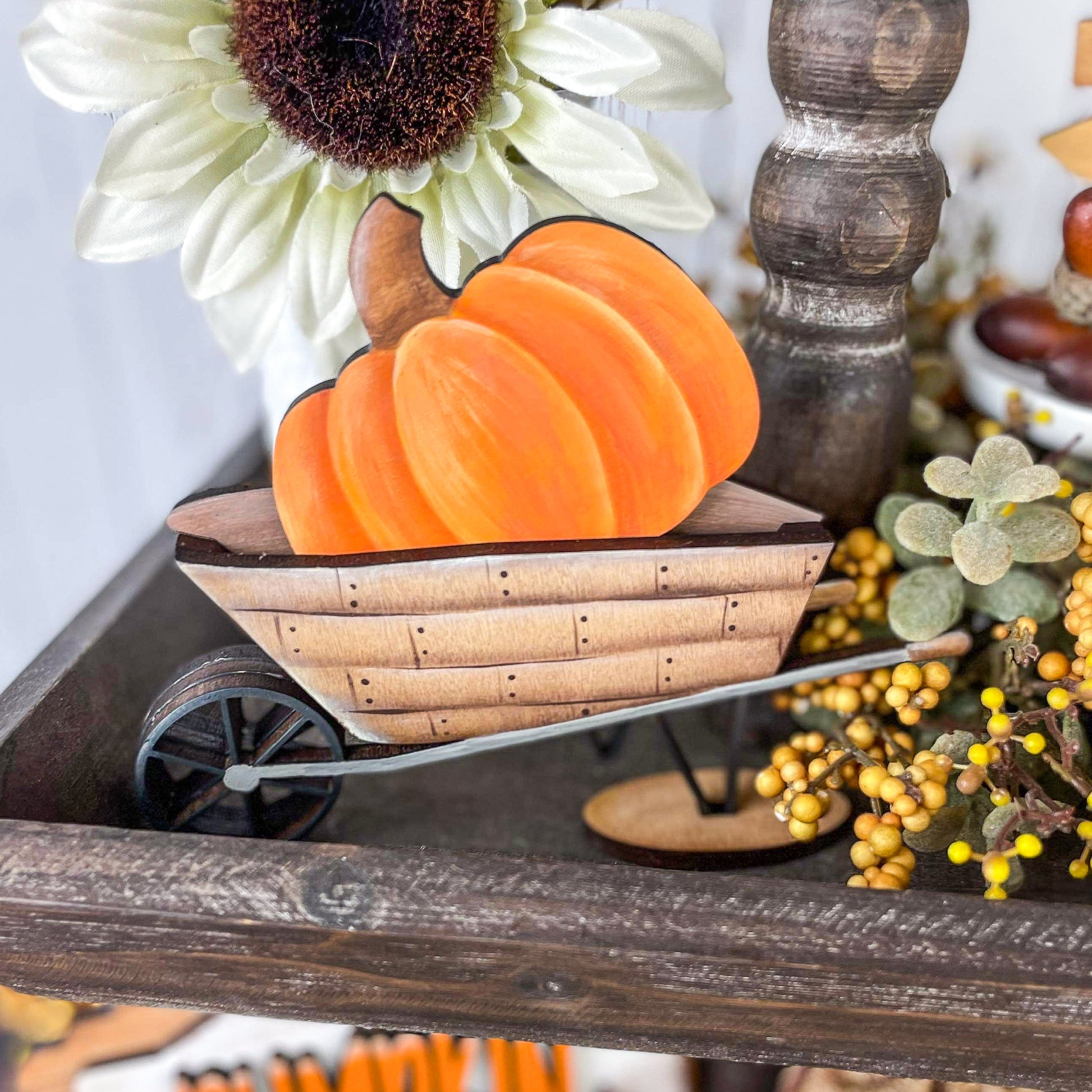 Wheelbarrow with pumpkin insert measures approximately 6" x 3".
