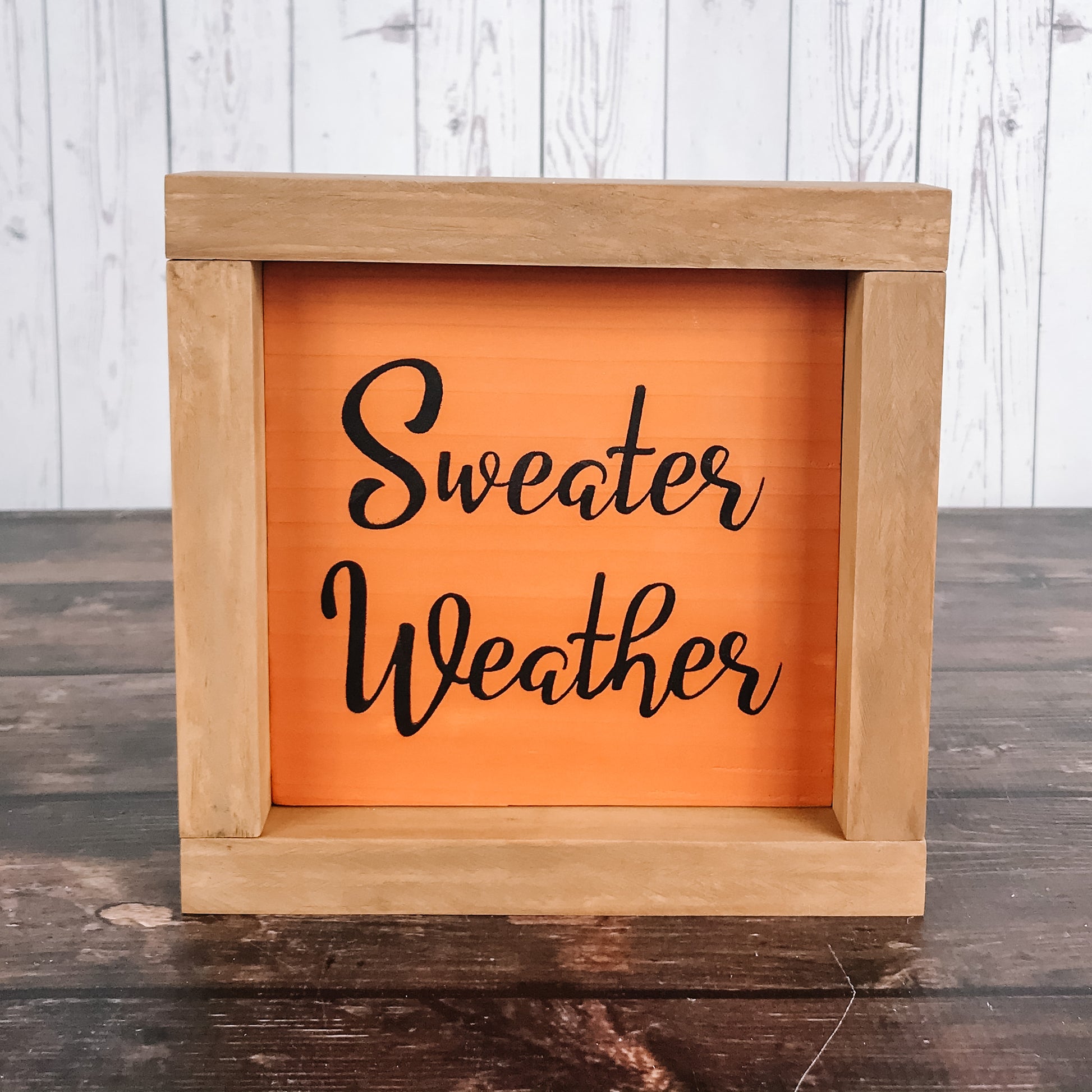 This fall home decor sign is perfect for the over-sized sweater gal! It can be used on a shelf, side table, or in a tier tray. It has a stained frame with a beautiful orange background with black writing.